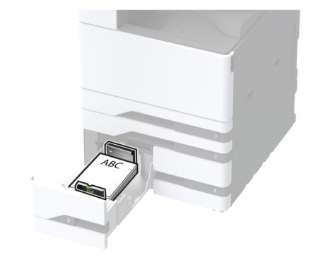 Introduzca la bandeja.Si es necesario, defina el tipo y el tamaño del papel para que coincida con el papel cargado en la bandeja.En el caso de que se utilice un finalizador, las imágenes se giran 180° al imprimirse.