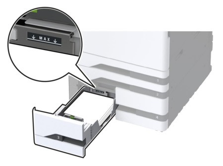 - Asegúrese de que la altura de la pila no exceda el indicador de capacidad máxima de papel. Si sobrepasa el límite, se pueden producir atascos de papel.