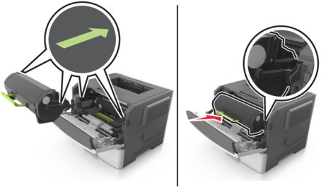- Insérez la cartouche de toner dans l'imprimante en alignant les rails latéraux de la cartouche avec les flèches situées sur les rails latéraux à l'intérieur de l'imprimante.N’exposez pas l’unité de traitement d’images à la lumière directe pendant plus de dix minutes. Une exposition prolongée à la lumière peut altérer la qualité d’impression.