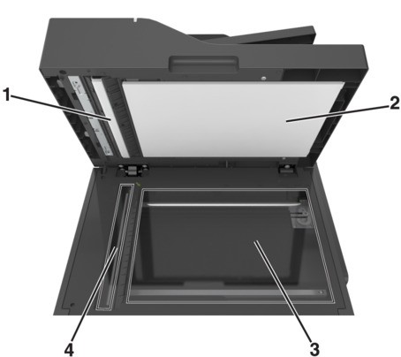 1Dessous blanc du couvercle du CAD2Dessous blanc du couvercle du scanner3Vitre du scanner4Vitre du CADFermez le couvercle du scanner.