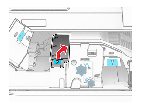 - Spostare la maniglia R2 verso sinistra, ruotare la manopola N4 in senso antiorario, quindi rimuovere la carta inceppata tra le porte N4 e N5.accertarsi che siano stati rimossi tutti i frammenti di carta.