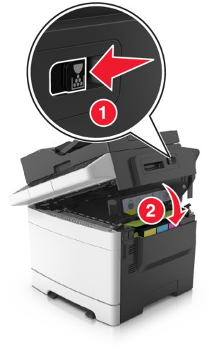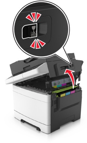 Far scorrere e mantenere il gancio di sblocco sul lato destro della stampante, quindi chiudere lentamente lo sportello superiore.