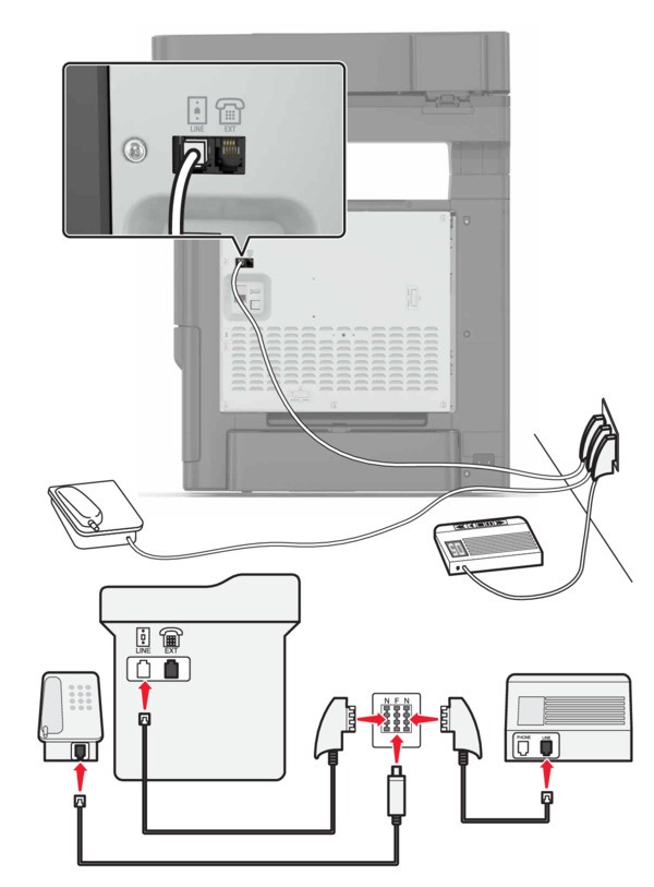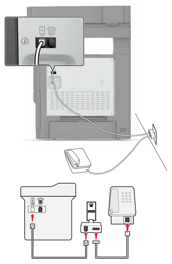 - Per collegare un telefono e una segreteria telefonica alla stessa presa a muro, collegare i dispositivi come indicato.