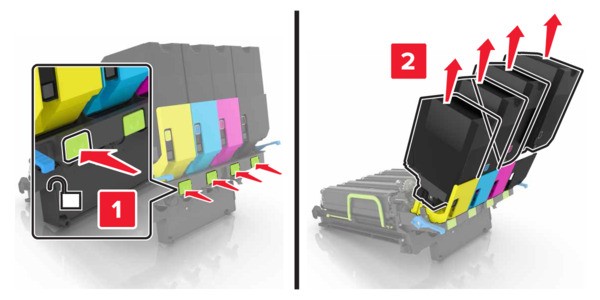 Estrarre il nuovo kit di imaging dalla confezione e rimuovere il materiale di imballaggio.il kit di imaging include il kit di imaging e le unità sviluppatore ciano, magenta e giallo.Rimuovere l'unità di imaging nero.Non esporre l'unità fotoconduttore alla luce diretta per più di 10 minuti. L’eccessiva esposizione alla luce può compromettere la qualità di stampa.Non toccare il tamburo del fotoconduttore lucido sotto l'unità di imaging. Ciò potrebbe influire sulla qualità dei processi di stampa futuri.