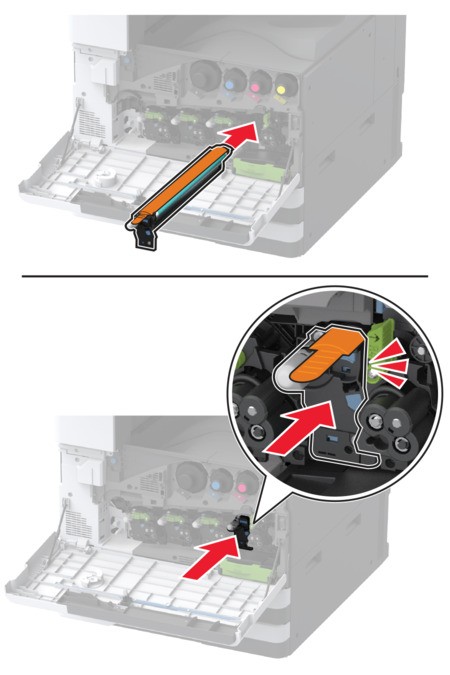 Estrarre dalla confezione la nuova unità fotoconduttore.Non esporre l’unità fotoconduttore alla luce diretta per più di un minuto. L’eccessiva esposizione alla luce può compromettere la qualità di stampa.non toccare il tamburo del fotoconduttore. Ciò potrebbe influire sulla qualità dei processi di stampa futuri.Inserire la nuova unità fotoconduttore fino a farlascattarein posizione.