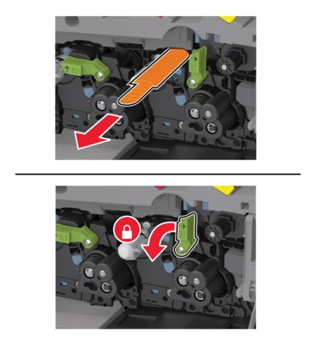 Posizionare il dispositivo di pulizia della testina di stampa nuovamente in sede.Inserire l’unità di trasferimento del toner di scarto fino a farlascattarein posizione, quindi bloccarla.