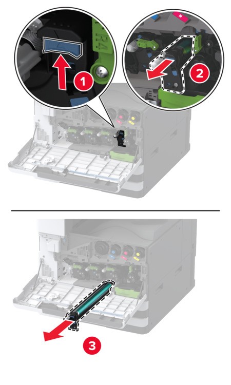 Per evitare fuoriuscite di toner, tenere l'unità in posizione verticale.Sbloccare l’unità fotoconduttore usata.
