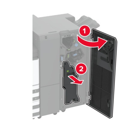 - Aprire lo sportello del fascicolatore, quindi estrarre l'unità per opuscoli.