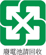 依環境保護署公告之廢棄物清理法第十五條應負回收、清除、處理責任之乾電池製造或輸入業者,乾電池裝配於物品中,且隨該物品銷售、贈送或促銷予消費者,得於該物品之個包裝、標籤或說明書上,標示回收標誌及回收標誌相鄰處說明「廢電池請回收」字樣。廢乾電池之回收標誌圖樣及回收標誌相鄰處說明字樣如下所示。請您將廢棄之乾電池送到標示可提供廢電池回收的廠商以提供正確的廢電池處理方法。