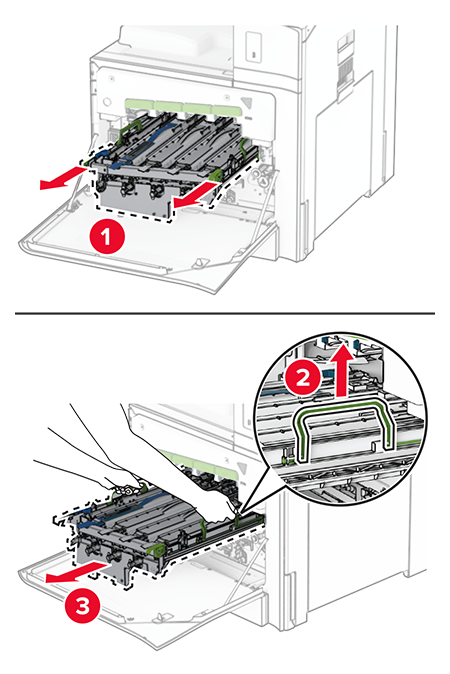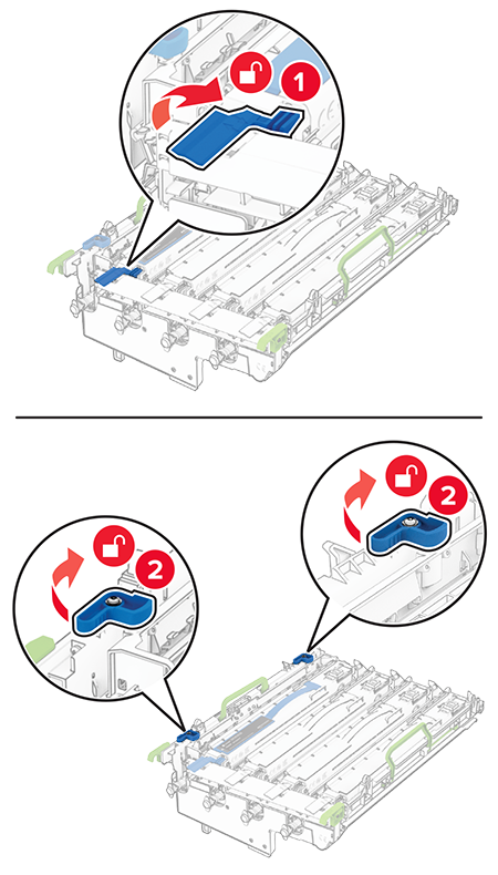 Non svasare l’unità di immagini nera. Verrà installata nel nuovo kit di immagini.Estrarre il nuovo kit immagini dalla confezione.il kit di immagini include il cestino di immagini e le unità sviluppatore ciano, magenta e giallo.non esporre il kit immagini alla luce diretta. L’eccessiva esposizione alla luce può compromettere la qualità di stampa.non toccare il tamburo del fotoconduttore. Ciò potrebbe influire sulla qualità dei processi di stampa futuri.