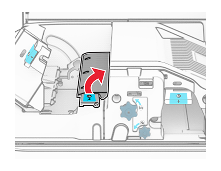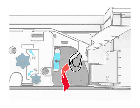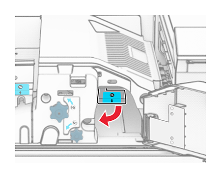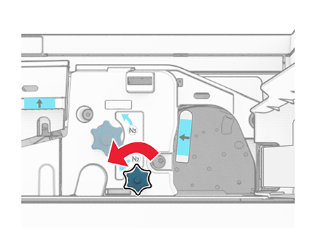 Spostare la maniglia R2 verso sinistra, ruotare la manopola N4 in senso antiorario, quindi rimuovere la carta inceppata tra le porte N4 e N5.accertarsi che siano stati rimossi tutti i frammenti di carta.