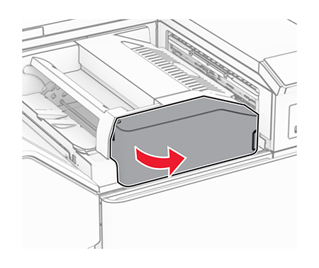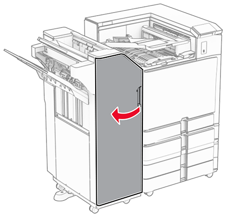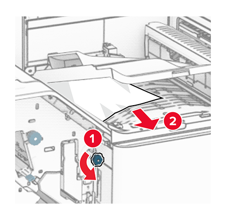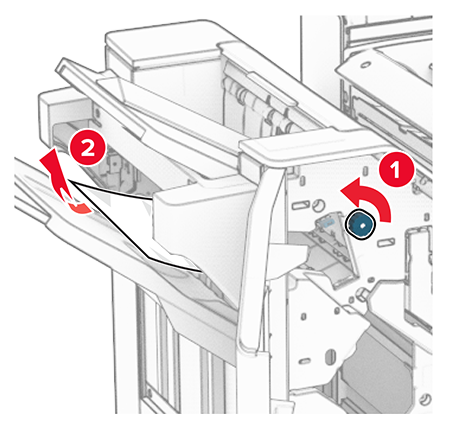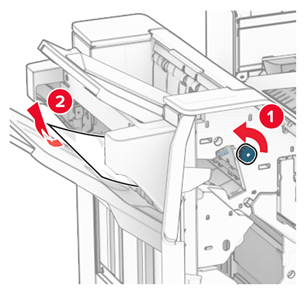 Chiudere il coperchio del trasporto carta F.Riportare la maniglia R4 nella posizione originale.Chiudere lo sportello H.Se la stampante è configurata con un trasporto della carta con opzione di piegatura, procedere come segue:- Rimuovere la carta inceppata dal raccoglitore 1.