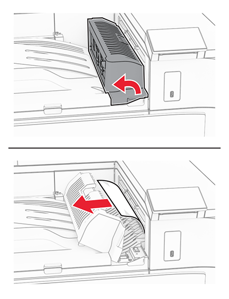 Chiudere lo sportello R1, quindi chiudere lo sportello I.Aprire il coperchio del trasporto carta F.