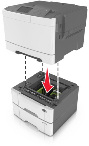 Breng de printer op gelijke hoogte met de duolade voor 650 vel en laat de printer op zijn plaats zakken.