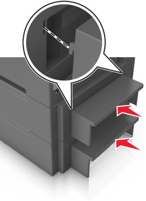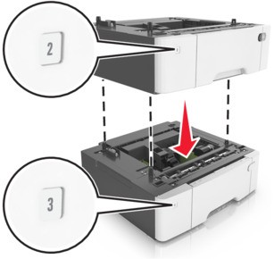 Plak de meegeleverde genummerde etiketten van boven naar beneden op de laden.De standaardlade voor 250 vel moet worden genummerd als lade 1.Plaats de lade in de buurt van de printer.Als u beide optionele laden installeert, moet de optionele lade voor 550 vel altijd zijn geïnstalleerd als de eerste lade bij een configuratie van beneden naar boven.Breng de duolade voor 650 vel op gelijke hoogte met de optionele lade voor 550 vel en laat deze op zijn plaats zakken.