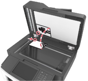 - Plaats het document met de bedrukte zijde naar beneden op de glasplaat in de hoek met het groene pijltje.