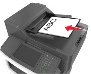 - Plaats het document met de bedrukte zijde naar boven en de korte zijde als eerste in de ADF-lade.