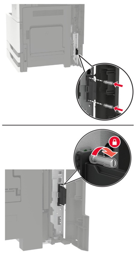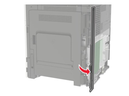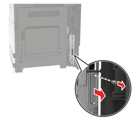 Verwijder de klep van de optionele sleuf.Verwijder de schroef met een kruiskopschroevendraaier. Til de klep omhoog en trek deze volledig naar buiten.