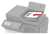 Gebruik de ADF voor documenten met meerdere pagina's of dubbelzijdige documenten. Plaats een origineel document met de bedrukte zijde naar boven. Zorg dat u de voorste papierrand goed uitlijnt bij documenten met meerdere pagina's. Stel de papiergeleiders van de ADF in op de breedte van het papier dat u gebruikt.