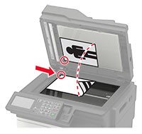 Gebruik de glasplaat voor documenten van één pagina of boekpagina's, kleine items (zoals briefkaarten of foto's), transparanten, fotopapier of dunne voorwerpen (zoals knipsels uit tijdschriften). Leg het document met de bedrukte zijde naar beneden in de hoek met de pijl.
