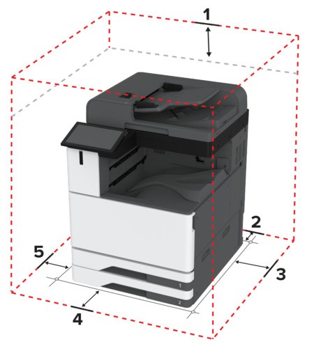 - Laat de volgende aanbevolen hoeveelheid ruimte vrij rondom de printer voor een goede ventilatie: