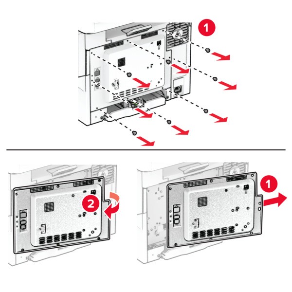 - Zet de printer uit.Trek de stekker van het netsnoer uit het stopcontact en haal het netsnoer uit de printer.Verwijder de beschermkap van de controllerkaart met behulp van een schroevendraaier met platte kop.De elektronische componenten van de controllerkaart raken gemakkelijk beschadigd door statische elektriciteit. Raak daarom eerst een metalen oppervlak aan voordat u de componenten of aansluitingen van de controllerkaart aanraakt.