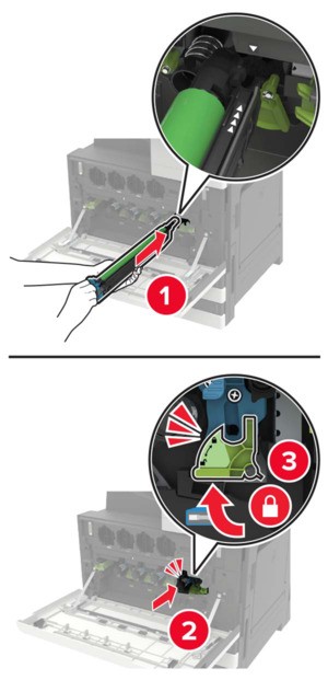 Rozpakuj nowy moduł fotoprzewodnika.Nie wystawiaj bębna światłoczułego na działanie światła słonecznego przez dłużej niż jedną minutę. Długotrwałe działanie światła może negatywnie wpłynąć na jakość wydruku.Nie wolno dotykać bębna światłoczułego. Może to wpłynąć na jakość kolejnych zadań drukowania.Włóż nowy bęben światłoczuły.