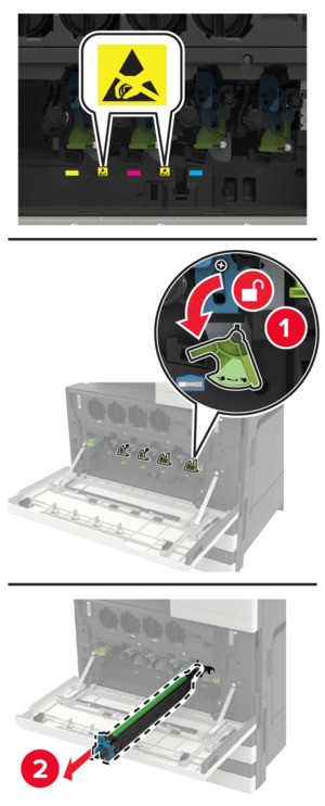 - Otwórz drzwiczki A.Wyjmij pojemnik na zużyty toner.