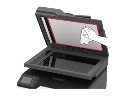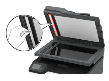 Zwilż miękką, niestrzępiąca się szmatkę i przetrzyj nią następujące miejsca:- Podkładka szyby automatycznego podajnika dokumentówW niektórych modelach drukarek ta lokalizacja posiada szybę ADF zamiast podkładki.