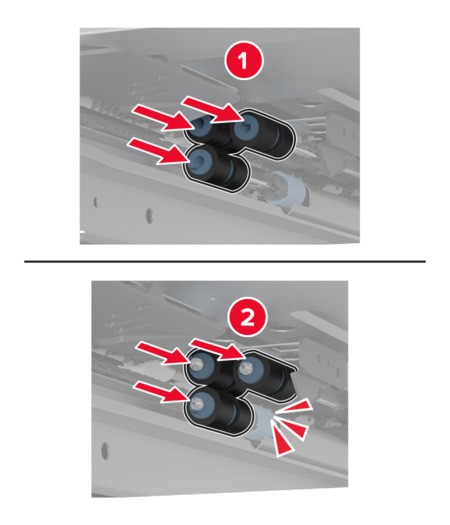 Zwilż wodą miękką, niestrzępiącą się szmatkę, a następnie wytrzyj rolki podające.Włóż zestaw rolek, ażzatrzaśnięciana swoim miejscu.
