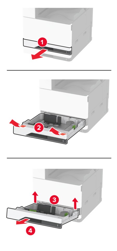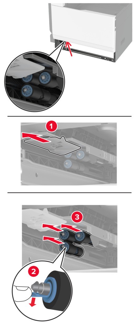 Wyjmij zestaw rolek tacy.Aby zapobiec uszkodzeniu na skutek wyładowania elektrostatycznego, dotknij dowolnego, odsłoniętego metalowego elementu korpusu drukarki zanim dotkniesz wewnętrznych elementów drukarki lub będziesz mieć kontakt z nimi.
