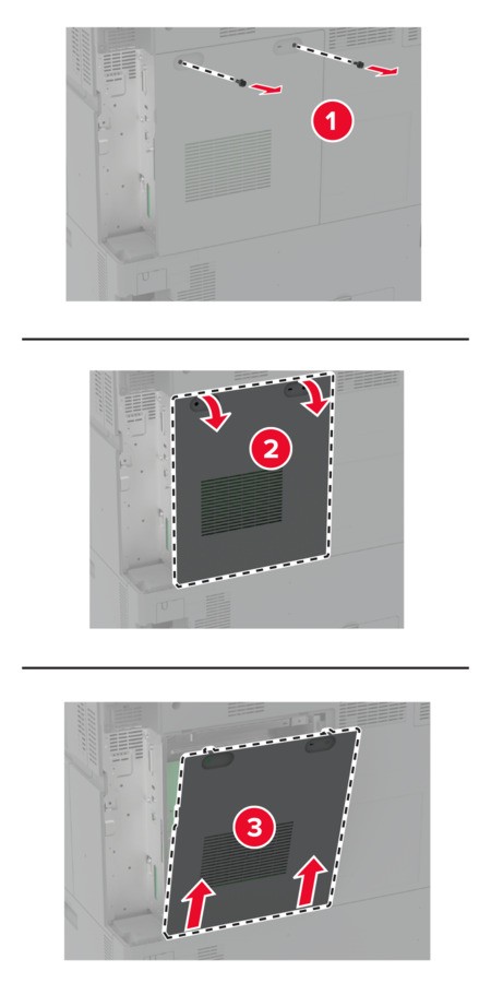 Załóż pokrywę dostępu do płyty kontrolera, aby zabezpieczyć płytę kontrolera drukarki.