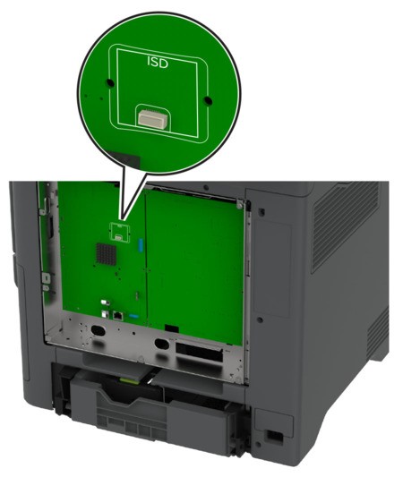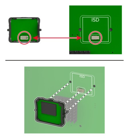 Rozpakuj inteligentny dysk pamięci (ISD).Należy unikać dotykania punktów połączeniowych ulokowanych wzdłuż krawędzi karty.Zlokalizuj odpowiednie złącze ISD.