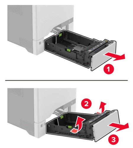 - Wyłącz drukarkę, a następnie wyjmij przewód zasilający z gniazdka elektrycznego.Zdejmij tacę.