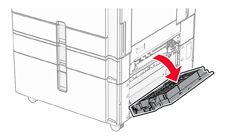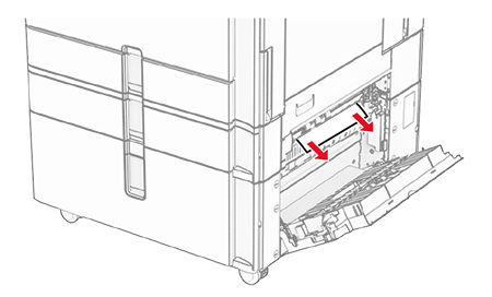 Remova o papel atolado dentro da porta E.Certifique-se de que todos os fragmentos de papel sejam removidos.