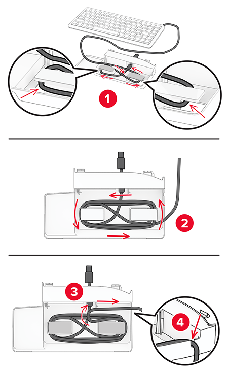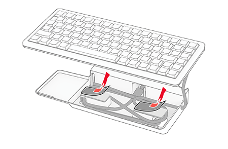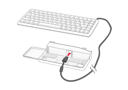 Desembale a bandeja do teclado.Insira o cabo do teclado na bandeja.