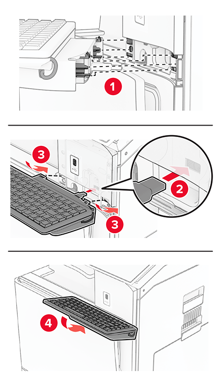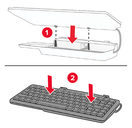 Alinhe a bandeja, conecte o cabo do teclado na impressora, insira a bandeja e fixe-a na impressora.