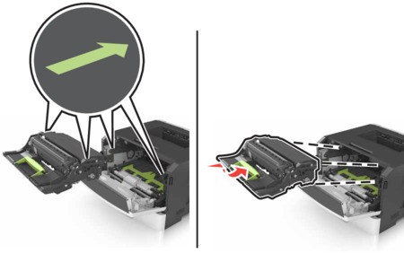 - Coloque a unidade de criação de imagens na impressora alinhando as setas nos trilhos laterais da unidade às setas nos trilhos laterais dentro da impressora.
