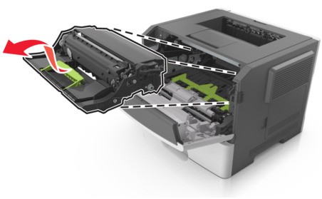 - Levante a alça verde e puxe a unidade de criação de imagens para fora da impressora.