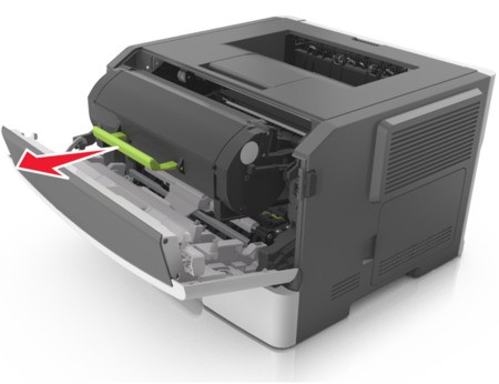 - Pressione o botão de liberação da porta na lateral direita da impressora e abra a porta frontal.