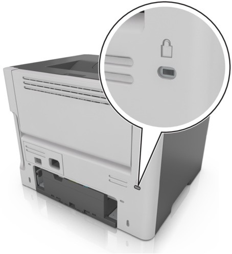 A impressora é equipada com um recurso de trava de segurança. Conecte uma trava de segurança compatível com a maioria dos computadores laptop no local mostrado e fixe a impressora.