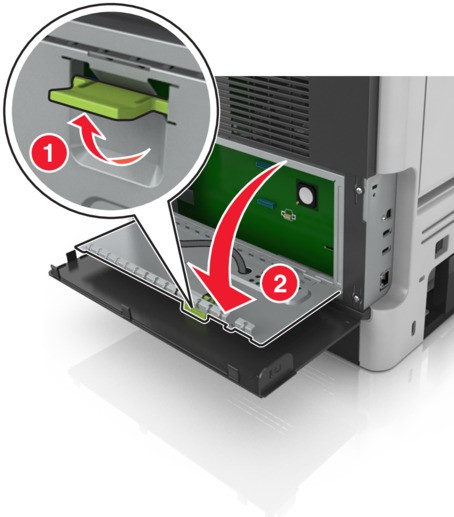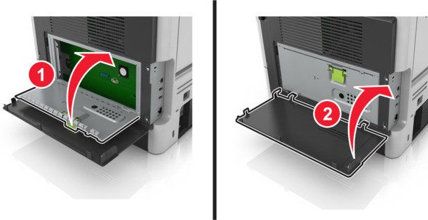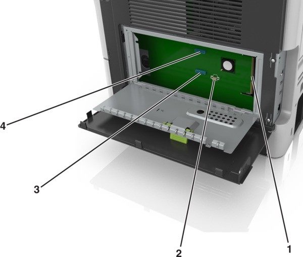 1Conector do cartão de memória2Conector da placa opcional3Conector do disco rígido da impressora4Conector da porta de soluções internasFeche a blindagem da placa de controle e, em seguida, feche a porta de acesso da placa de controle.
