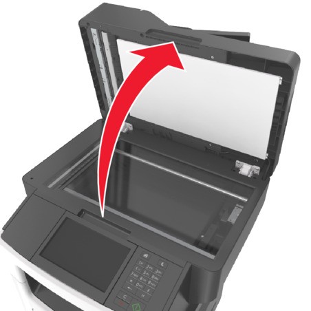 - Umedeça com água um pano limpo e sem fiapos ou uma toalha de papel.Abra a tampa do scanner.