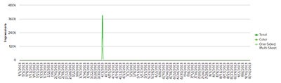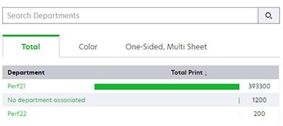 O gráfico mostra a tendência das impressões totais, coloridas e unilaterais impressas em várias folhas em toda a organização.Principais departamentos de uma organização