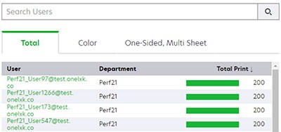 A seção mostra a lista de usuários e suas impressões impressas correspondentes. Você pode usar as guias Total, Colorido e Unilateral, várias folhas para visualizar as respectivas impressões de impressão em cada categoria.- Você pode pesquisar um usuário específico digitando o nome do usuário no campo de texto Pesquisar usuários.
