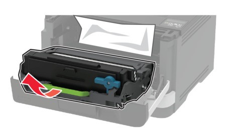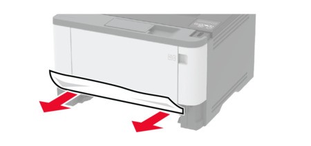 Remova o papel atolado.A parte interna da impressora pode estar quente. Para reduzir o risco de ferimentos devido a um componente quente, espere a superfície esfriar antes de tocá-la.Certifique-se de que todos os fragmentos de papel sejam removidos.