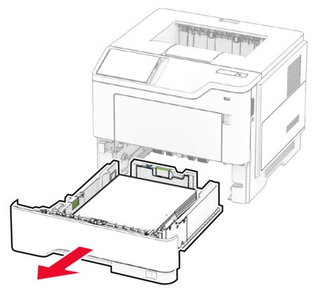 - Remova a bandeja.Evite atolamentos de papel, não remova a bandeja durante as impressões.