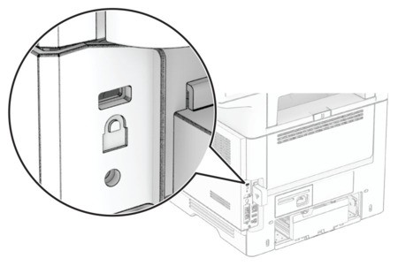 A impressora é equipada com um recurso de trava de segurança. Conecte uma trava de segurança compatível com a maioria dos computadores laptop no local mostrado e fixe a impressora.