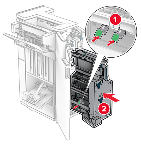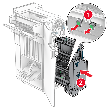 Вытащите модуль создания буклетов, а затем извлеките использованные держатели картриджа со скрепками.