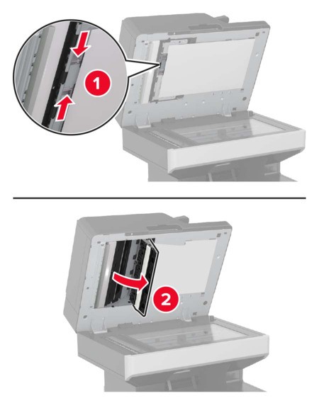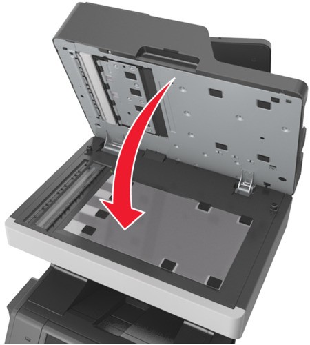 Протрите стекло сканера УАПД под дверцей УАПД.Закройте нижнюю дверцу УАПД.Поместите белую нижнюю сторону крышки сканера на стекло сканера, затем закройте крышку сканера.